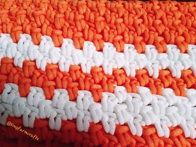 Materials: bernat maker outdoor: 3 skeins orange stripe, 4-5 skeins solid orange (depends on how long you want the blanket and wide you want the trim)