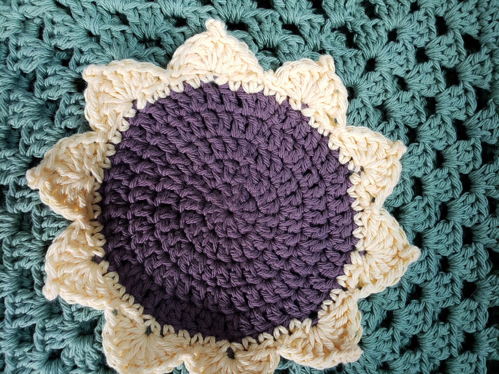 Round 2: this round creates the petals: in each ch 1 space in the round before 4 dc, ch 1, sl to ch 1 this creates the point on the petal, 4 dc; sl to skip 3 and sl to sc from row before. Repeat for each ch 1 space; Creates 10 petals;